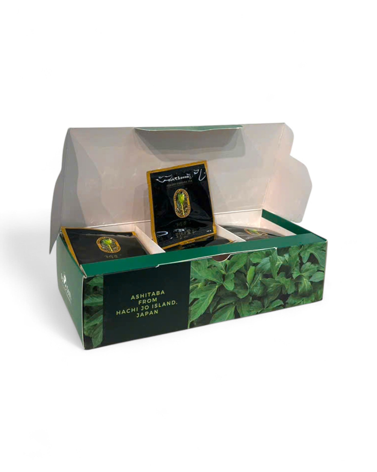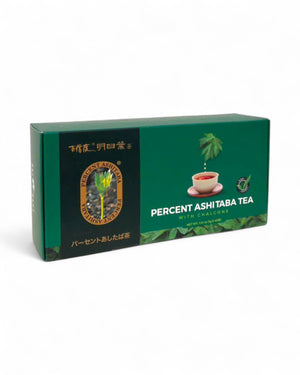 Percent Ashitaba Tea is made from naturally grown, pesticide-free Ashitaba leaves from Hachi Jo Island, Japan, using an exclusively patented roasting technique. This 100% natural tea contains no preservatives, no chemical additives, and is caffeine-free, making it a safe and refreshing choice for daily wellness.
