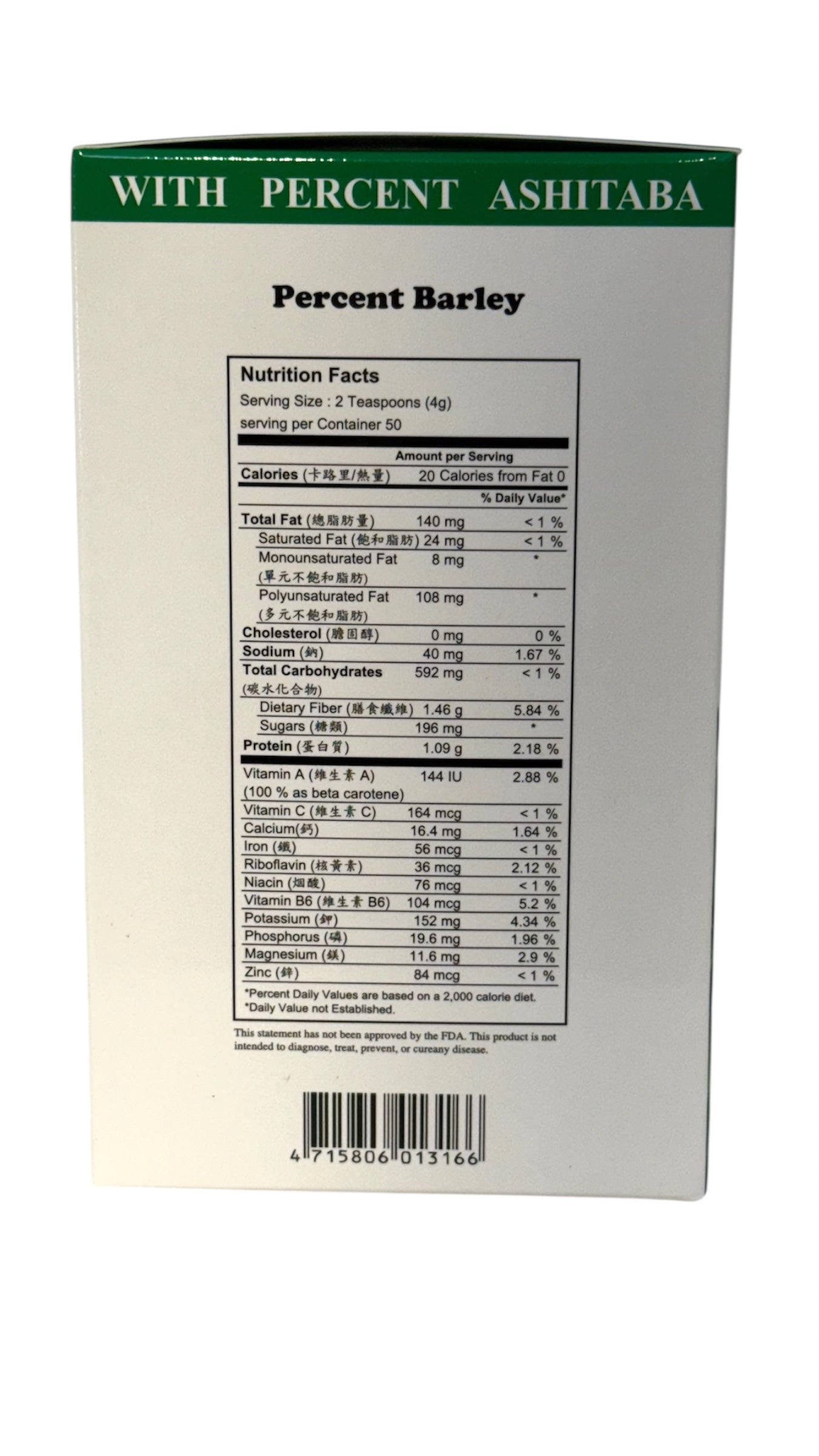 Percent Barley Green is a premium superfood blend of organic Australian Barley Grass and Ashitaba from Hachi Jo Island, Japan, designed to provide complete and balanced nutrition straight from nature.